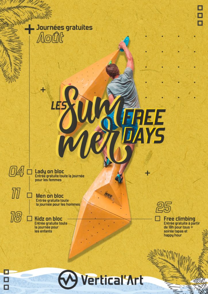 Suite au succès de nos événements de gratuité du mois de juillet, nous poursuivons nos Summer Free Days tout au long du mois d’août dans vos salles d’escalade Vertical’Art. Envie de passer un été sportif en famille, entre collègues ou entre amis ? Vous pouvez cocher dès maintenant vos dates dans vos agendas !